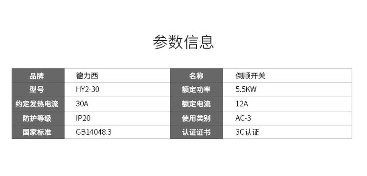 德力西倒順開關(guān) HY2-30/5.5KW 額定電流12A |