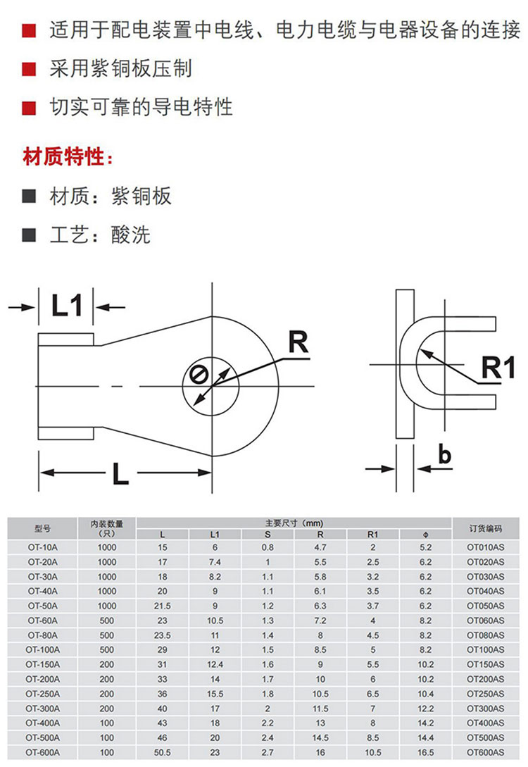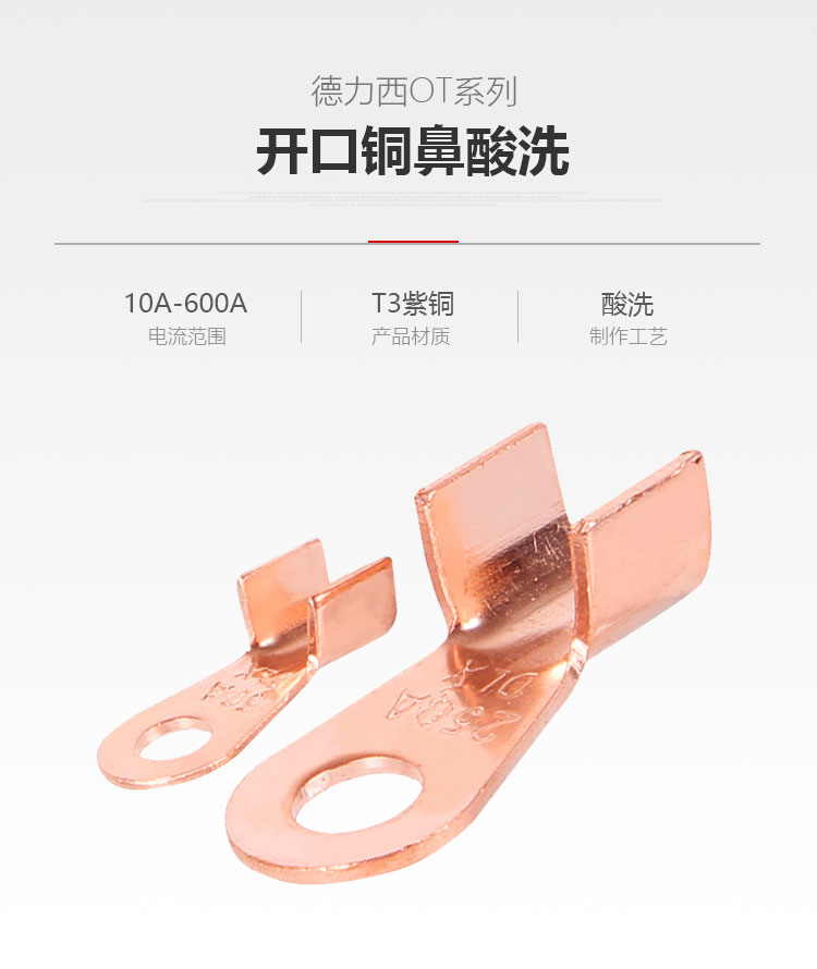 德力西OT開口銅鼻子 T3純紫銅材質(zhì) 酸洗工藝 電流范圍30A-600A可選 德力西正品OT開口鼻 每包數(shù)量請查看產(chǎn)品描述 |