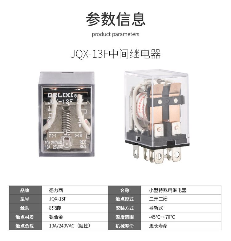 德力西小型中間繼電器CDZ9-62PL(JQX-13F/2Z) 寬腳繼電器(8只腳) 電流10A 小型大功率中間繼電器 部分規(guī)格訂單產(chǎn)品 |