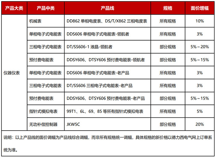 因公司的發(fā)展需要及為更好的滿足市場(chǎng)的需求,提供更加專業(yè)、精細(xì)化的產(chǎn)品及服務(wù),經(jīng)研究決定,自2022年8月1日起對(duì)德力西電表產(chǎn)品面價(jià)進(jìn)行調(diào)整,具體調(diào)價(jià)產(chǎn)品線綜合幅度見(jiàn)附表1。