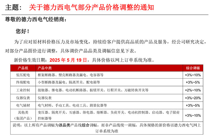 德力西電氣2025年5月19日漲價通知