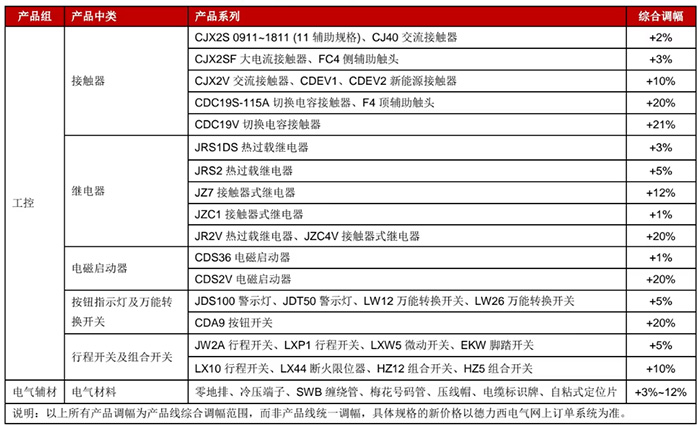 德力西電氣為促進(jìn)企業(yè)健康發(fā)展,持續(xù)給客戶提供高品質(zhì)的產(chǎn)品及服務(wù),經(jīng)公司研究決定,對(duì)工控、電氣輔材部分產(chǎn)品面價(jià)進(jìn)行調(diào)整,具體調(diào)價(jià)產(chǎn)品線及調(diào)幅信息見(jiàn)下表。