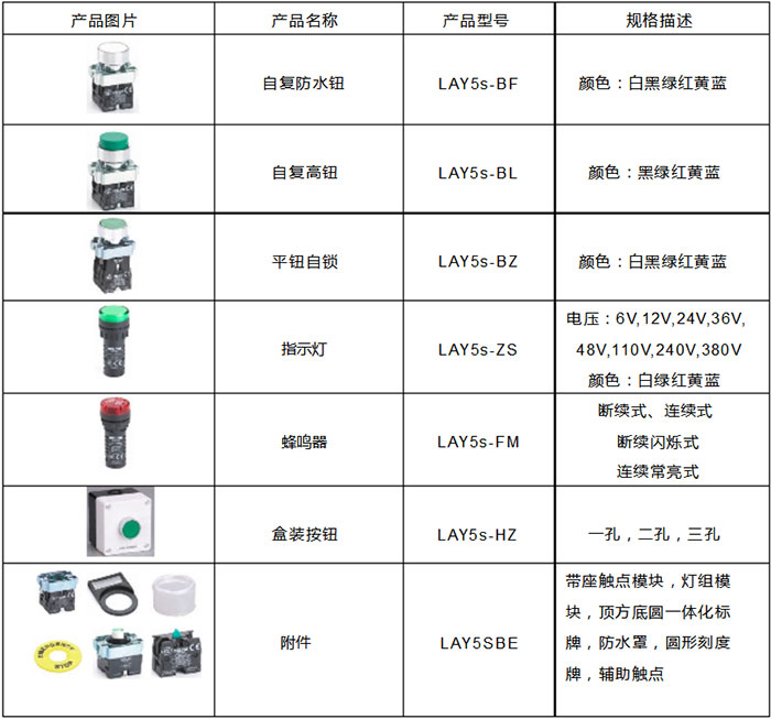 2、LAY5s帶燈按鈕全為L(zhǎng)ED燈珠,因此物料編碼最后一項(xiàng)無(wú)燈型說(shuō)明;LAY5分“L”(LED)、“N” (氖燈)、白熾燈燈珠。