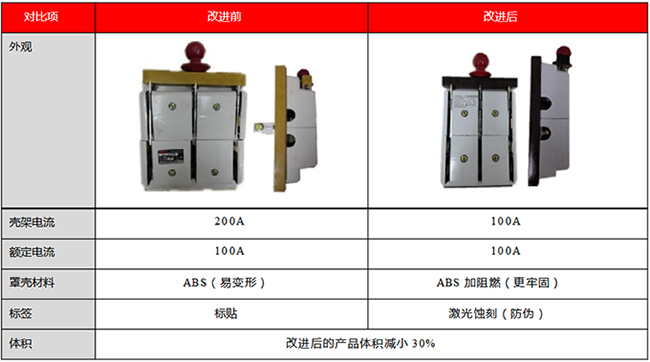 為了更好地滿足市場需求,提升客戶滿意度,德力西官方旗艦店對原HS11-100刀形隔離器進(jìn)行了全新改進(jìn)升級, 改進(jìn)后的新型HS11-100刀形隔離器電流殼架等級降低、體積小巧,外形更美觀,具體改進(jìn)如下。