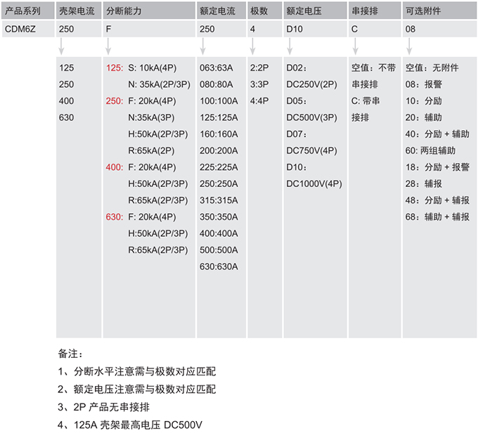 例:物料編碼:M6Z250F2504D10 物料描述:CDM6Z-250F/250A 4P DC1000V
