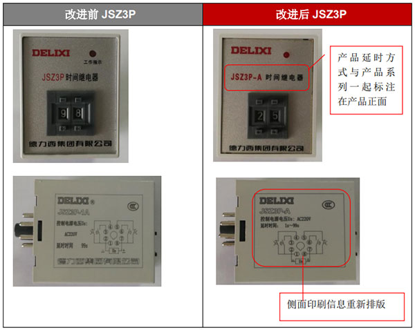 為了更好地規(guī)范產(chǎn)品標(biāo)識的一致性,滿足市場需求,提升客戶滿意度,自2020年7月1日起,德力西電氣公司對時間繼電器JSZ3P產(chǎn)品進(jìn)行了改進(jìn)。具體見下: