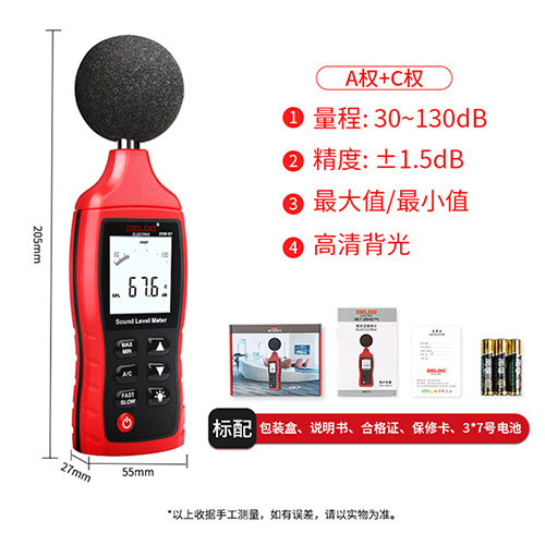 德力西的噪音測試儀具有高精度全自動測量、A/C雙計權、采用電容式麥克風傳感器、IP54防護等級、高清背光顯示、快慢加權功能;該設備是全金屬外殼,防塵防水防摔;多領域一機測量,可用于測量工廠、辦公室、學校、住宅區(qū)等各種環(huán)境。